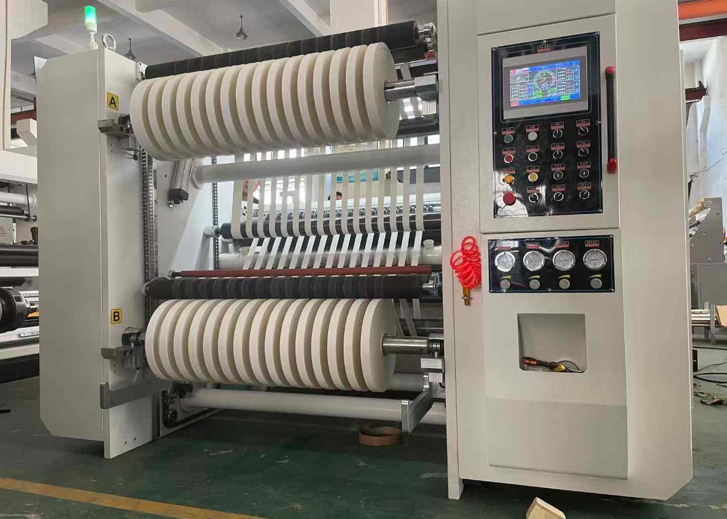 This machine suitable for a lot of paper,such as 30-400g/m2,paper&film laminated,PET/PVC etc best jumbo roll cutting machine.